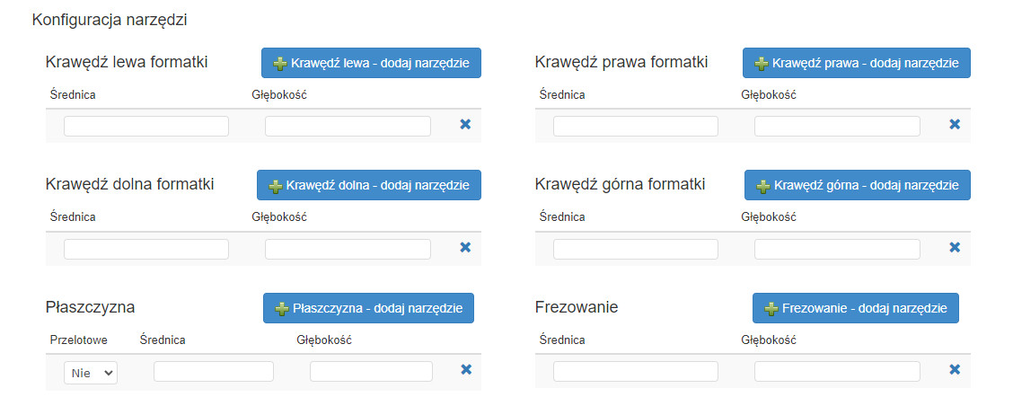 W ostatniej sekcji dodajemy dostępne narzędzia. Określamy ich średnicę, maksymalną głębokość oraz czy są przelotowe, jeżeli dotyczą nawiertów w płaszczyźnie.