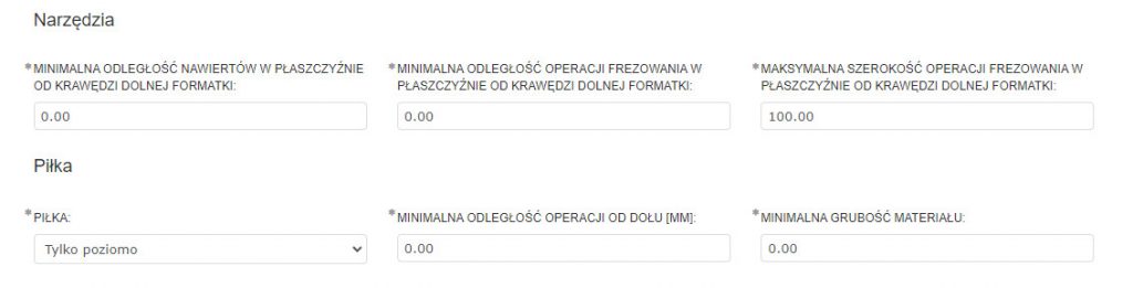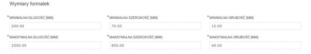 W sekcji wymiary formatek ustawiamy minimalne i maksymalne wartości płyty, którą możemy włożyć do wykonania nawiertów.