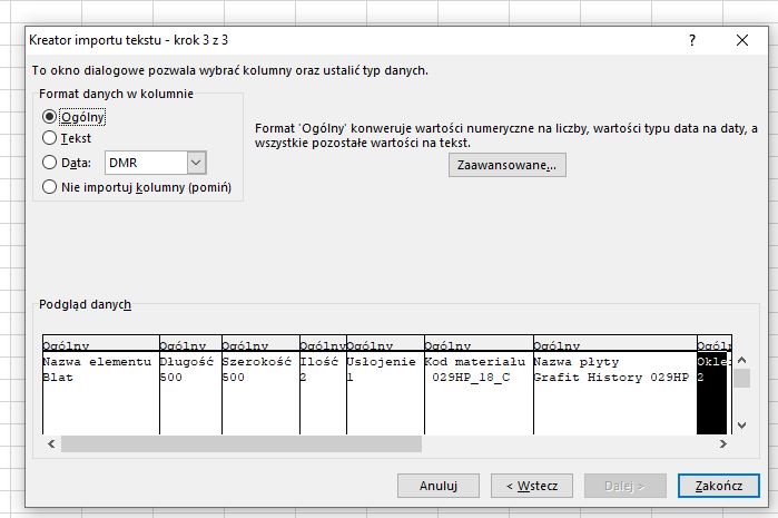 Ostatnim już krokiem importu jest ustawienie formatu danych w kolumnie, standardowo jest to format „Ogólny”.