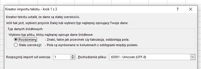 Następnie program przeniesie nas do pierwszego kroku importu, należy tutaj zaznaczyć typ pliku jako „Rozdzielany”, kolejno ustawić odpowiednie pochodzenie pliku „Unicode (UTF-8)”.
