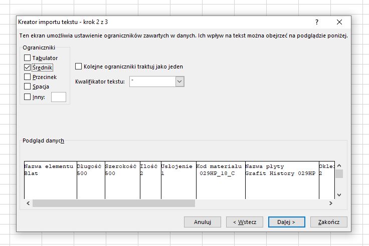 W kroku drugim należy ustawić ogranicznik jako „Średnik”, odpowiednie formatowanie komórek można zobaczyć na podglądzie danych.