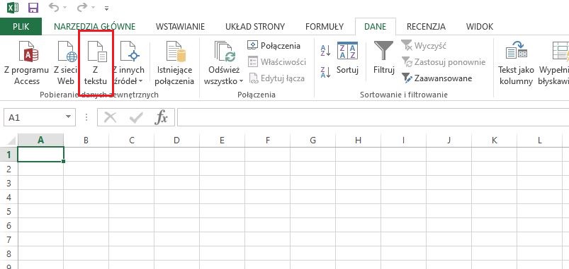 Aby plik CSV załadował się poprawie do programu excel należy stworzyć nowy arkusz i w tabeli „DANE” skorzystać z funkcji pobierania danych zewnętrznych „Z tekstu”