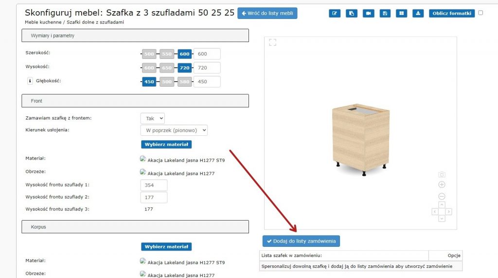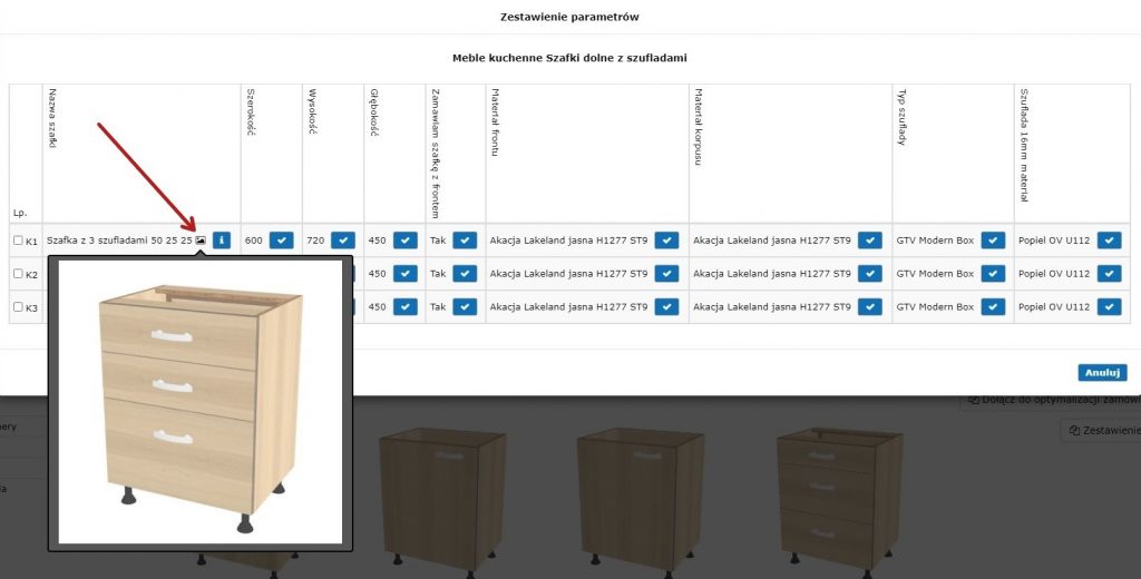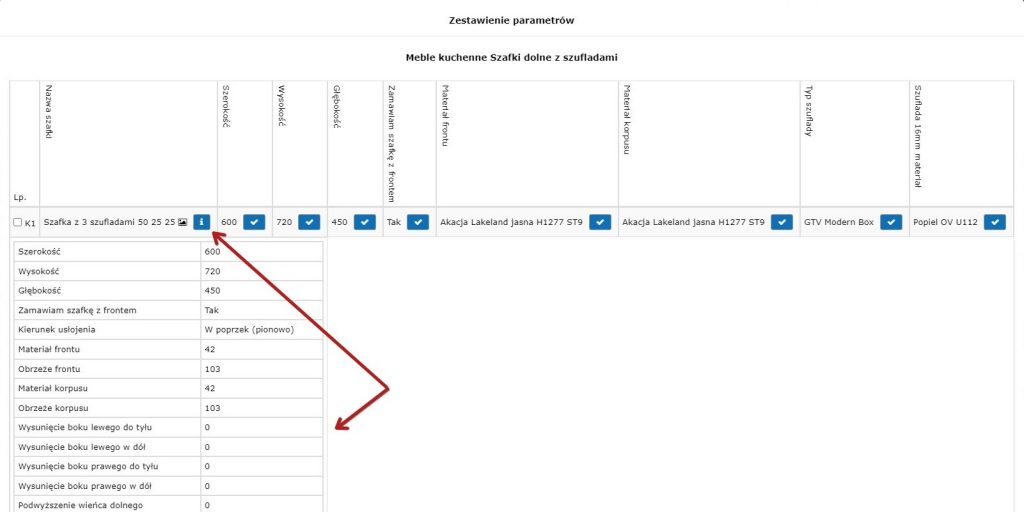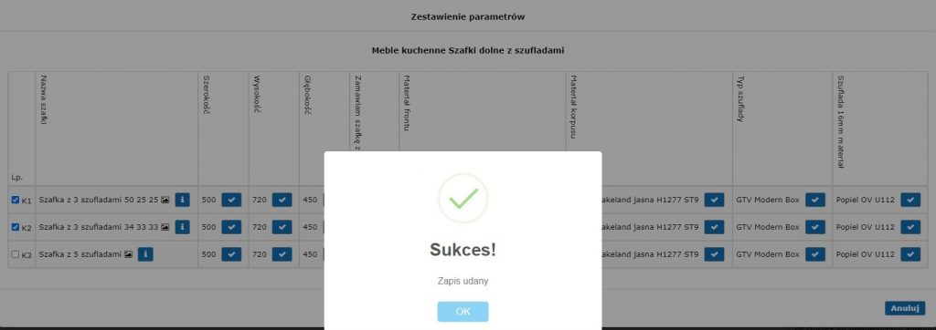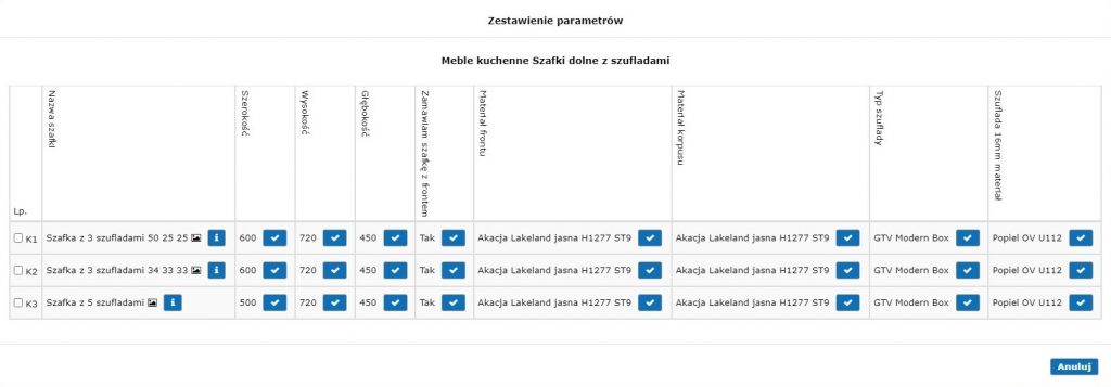 Lista zawiera zestawienie parametrów mebli znajdujących się w koszyku np. nazwę, szerokość, wysokość, głębokość, opcję „Zamawiam szafkę z frontem”, materiał frontu, materiał korpusu.