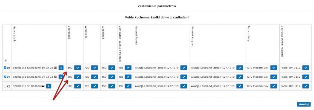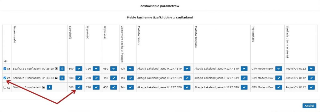 W celu zmiany wartości danego parametru jednej lub jednocześnie większej ilości mebli należy najpierw zaznaczyć daną pozycję/pozycje w kolumnie „Lp.”, a następnie kliknąć przycisk „Check” znajdujący się przy wartości którą chcemy wprowadzić do pozostałych zaznaczonych mebli.