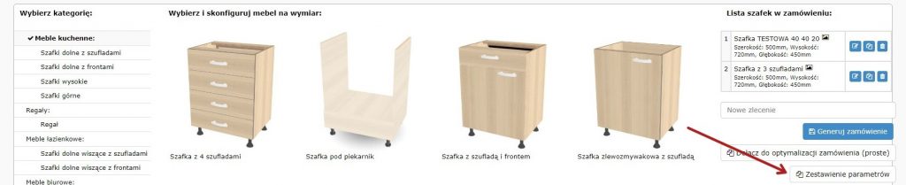 Następnie w koszyku wyświetli się opcja „Zestawienie parametrów” po kliknięciu której otwiera się okno z listą.