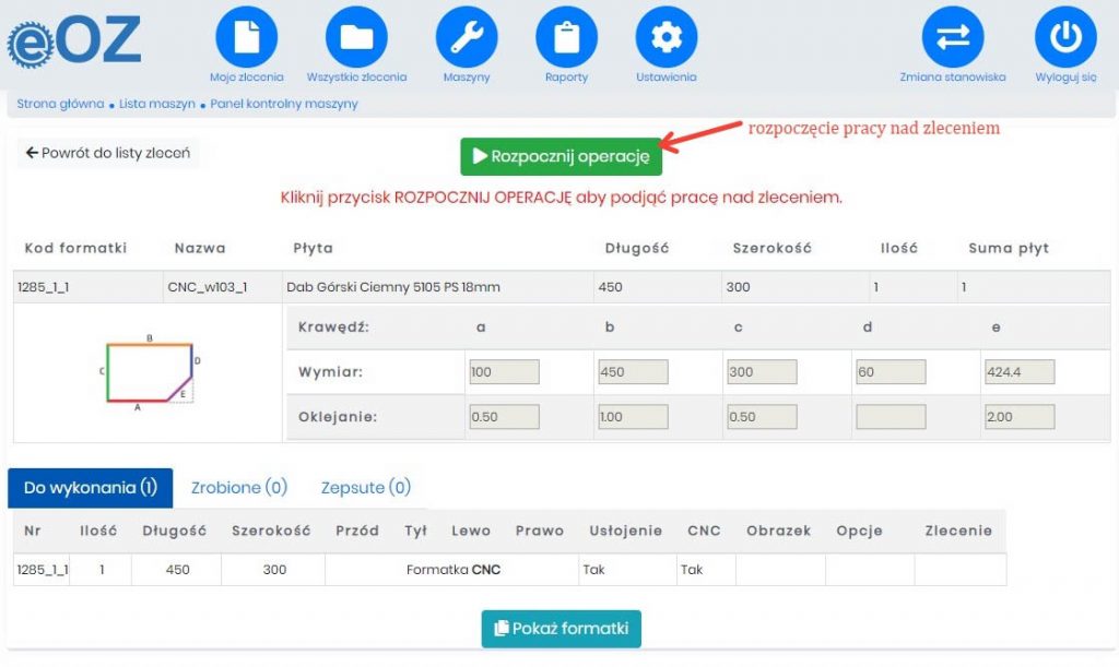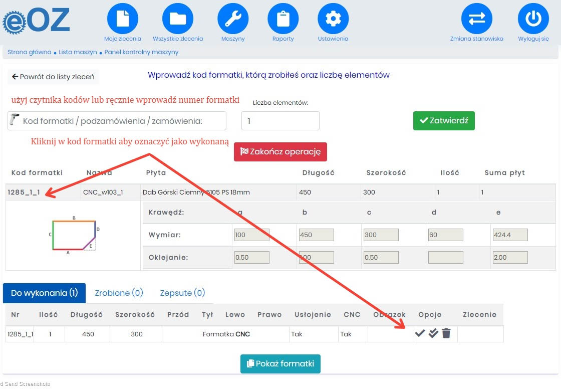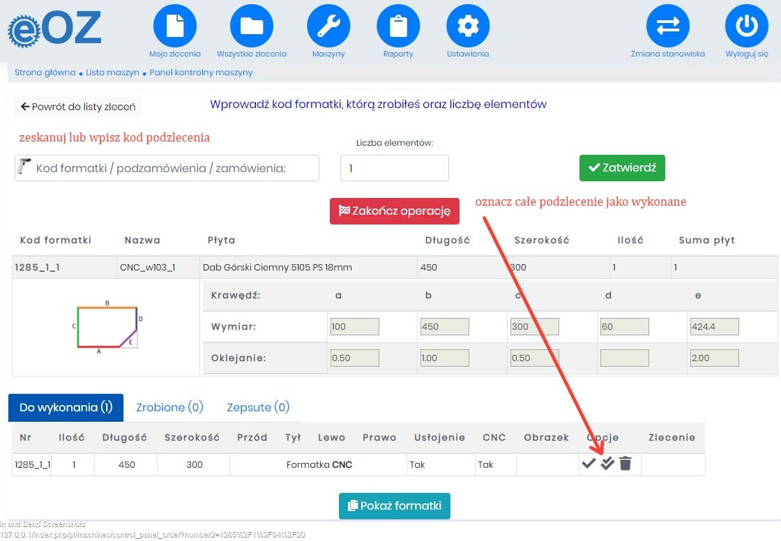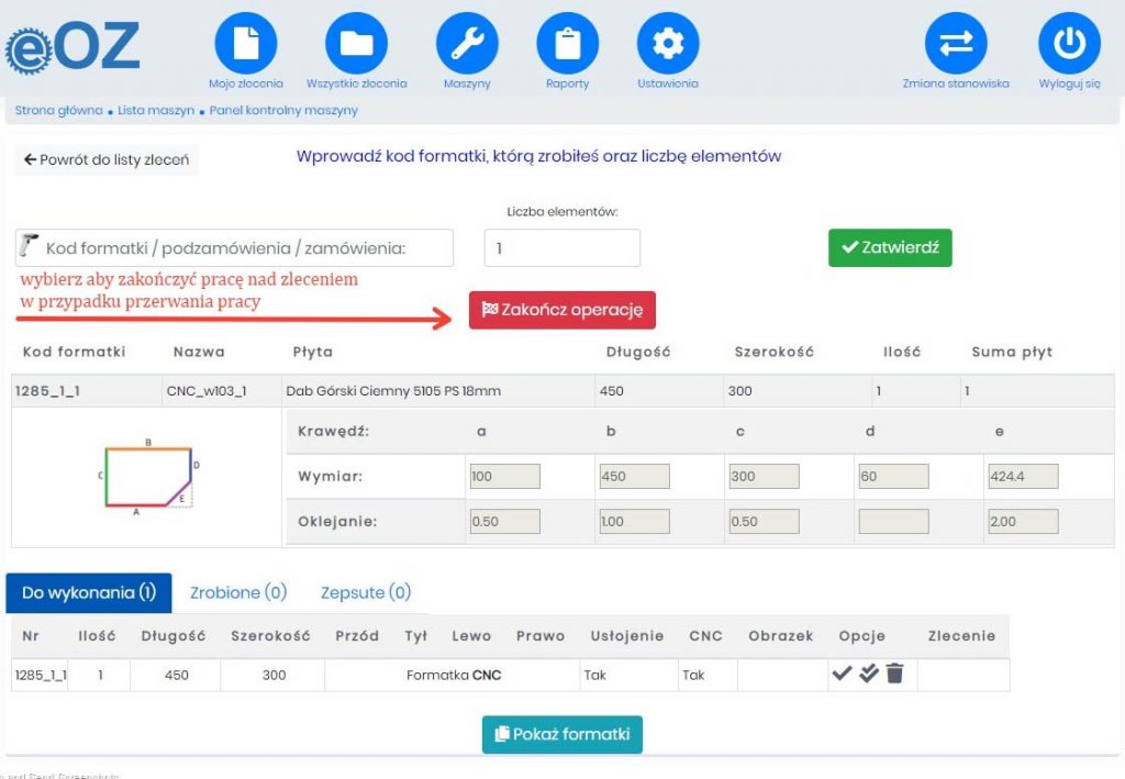 W przypadku przerwania pracy nad zleceniem przez pracownika lub oznaczenia jakieś formatki jako uszkodzona istnieje konieczność ręcznego zamknięcia zlecenia. Natomiast podczas normalnego trybu pracy takie zamknięcie i przekazanie zlecenia dalej następuje automatycznie z chwilą oznaczenia jako wykonanie ostatniej formatki.
