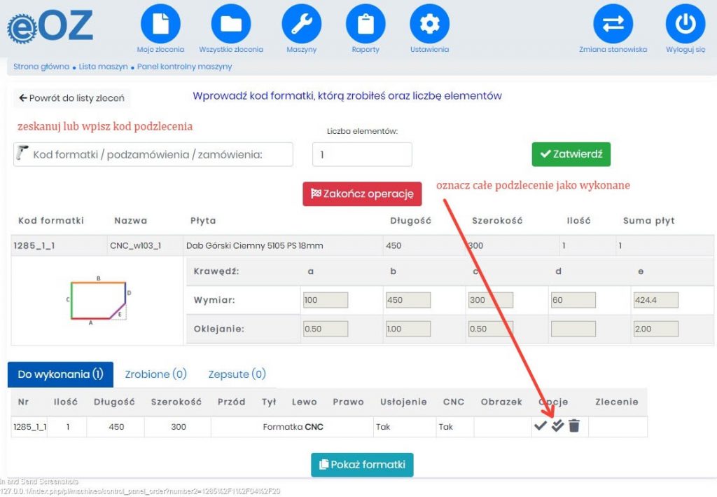 W celu odznaczenia w systemie konkretnej formatki jako wykonanej można: