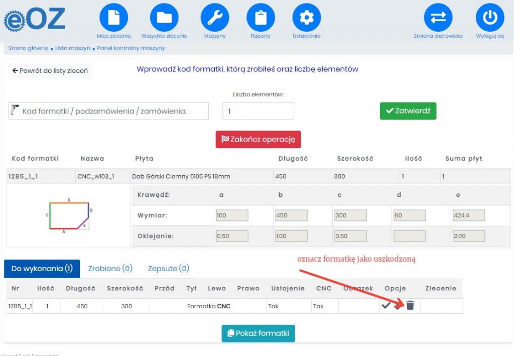 W przypadku, gdy formatka zostanie uszkodzona, użytkownik może ją oznaczyć jako uszkodzoną.