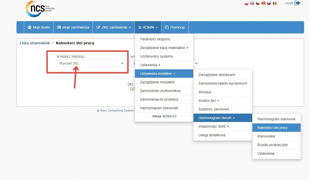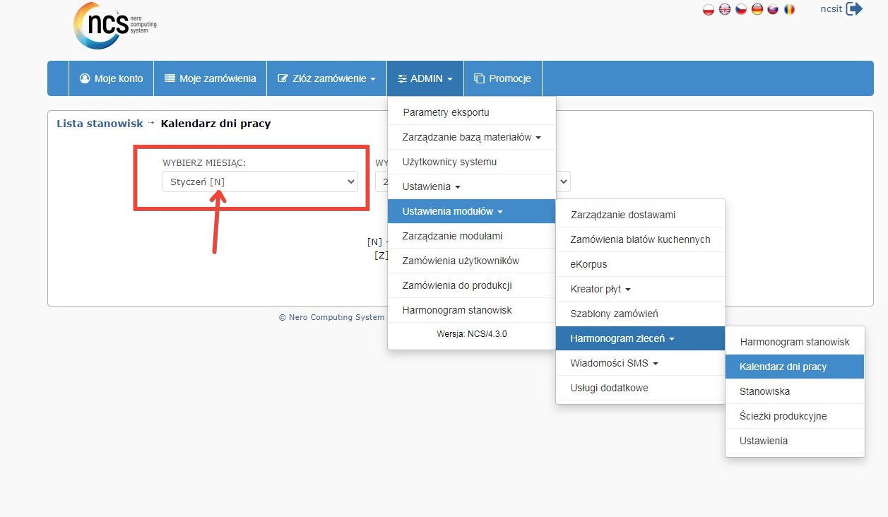 Admin -> Ustawienia modułów -> Harmonogram zleceń -> Kalendarz dni pracy