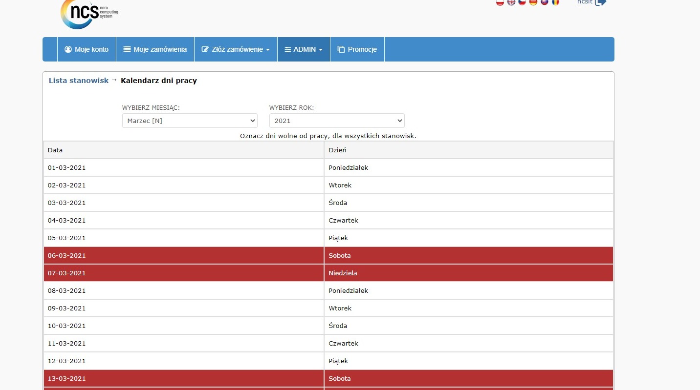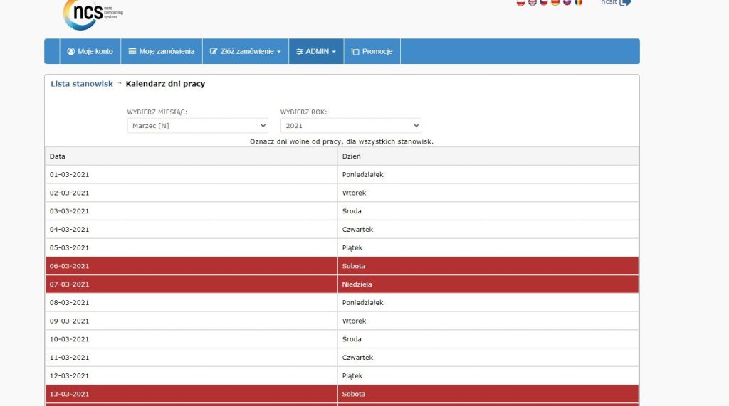 System pozwala określić jakie dni każdego miesiąca są dniami pracującymi i dniami wolnymi – dni te będą uwzględniane podczas automatycznego tworzenia harmonogramu zleceń
