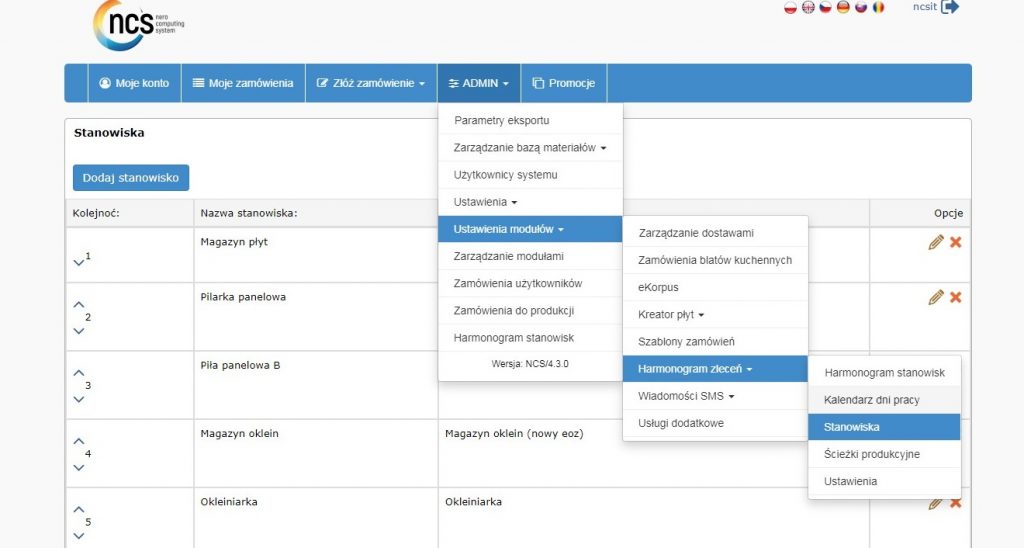Admin -> Ustawienia modułów -> Harmonogram zleceń -> Stanowiska pracy