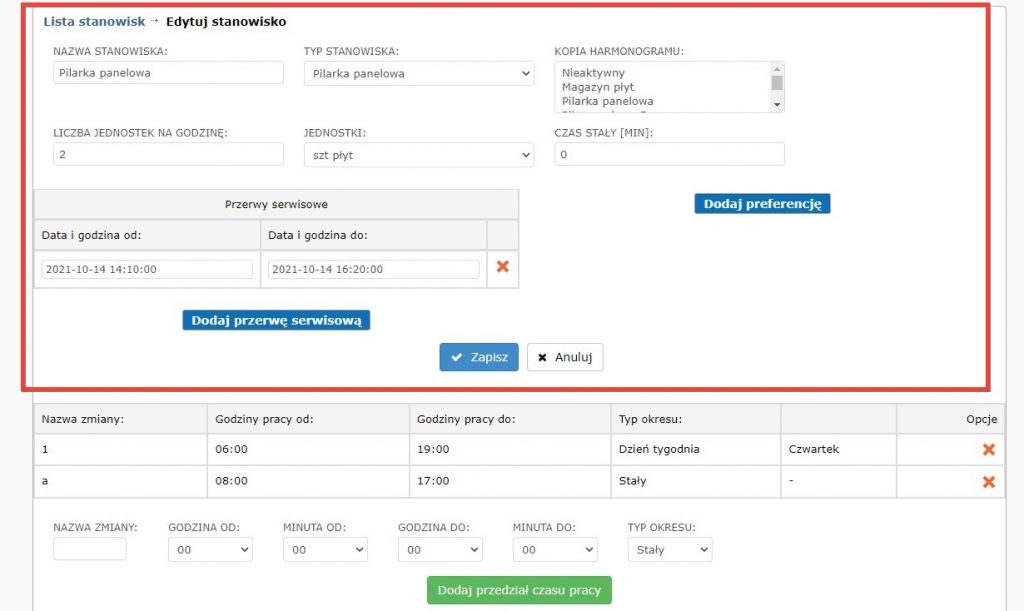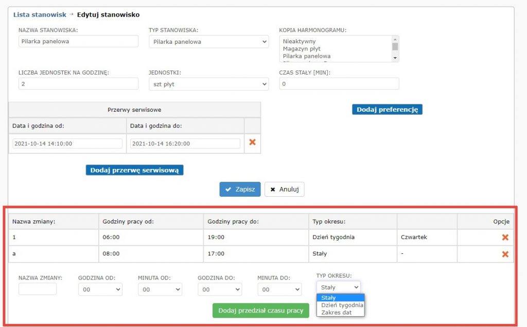 Zawsze musimy określić co najmniej jeden zakres godzin w jakich stanowisko pracy pracuje. Istnieje również możliwość dodać kilka zmian z przerwami, wówczas harmonogram weźmie to pod uwagę a w przypadku zleceń, których obliczony czas wykonania będzie dłuższy niż zmiana – system podzieli je na bloki i wprowadzi jego część do realizacji na kolejnej zmianie.