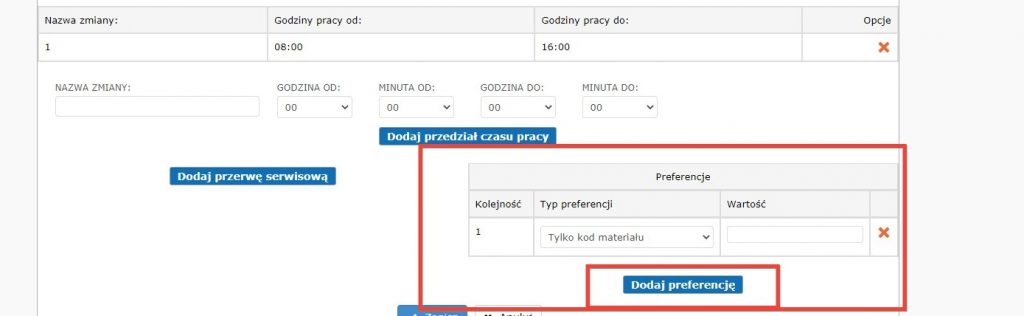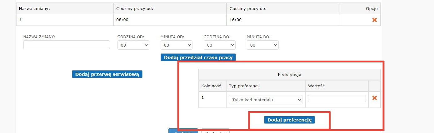 - Preferowany kod materiału – Stanowisko będzie obsługiwało wszystkie typy materiałów ale w przypadku, gdy zlecenie będzie zawierało podany kod materiału wówczas zostanie przydzielone tylko na to stanowisko