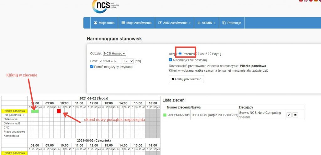 - Następnie poruszając myszką po tym samym typie stanowiska system podświetli na czerwono miejsce, które możesz oznaczyć jako nowy termin rozpoczęcia realizacji zlecenia. Aby zatwierdzić przenoszenie kliknij w wybrane miejsce