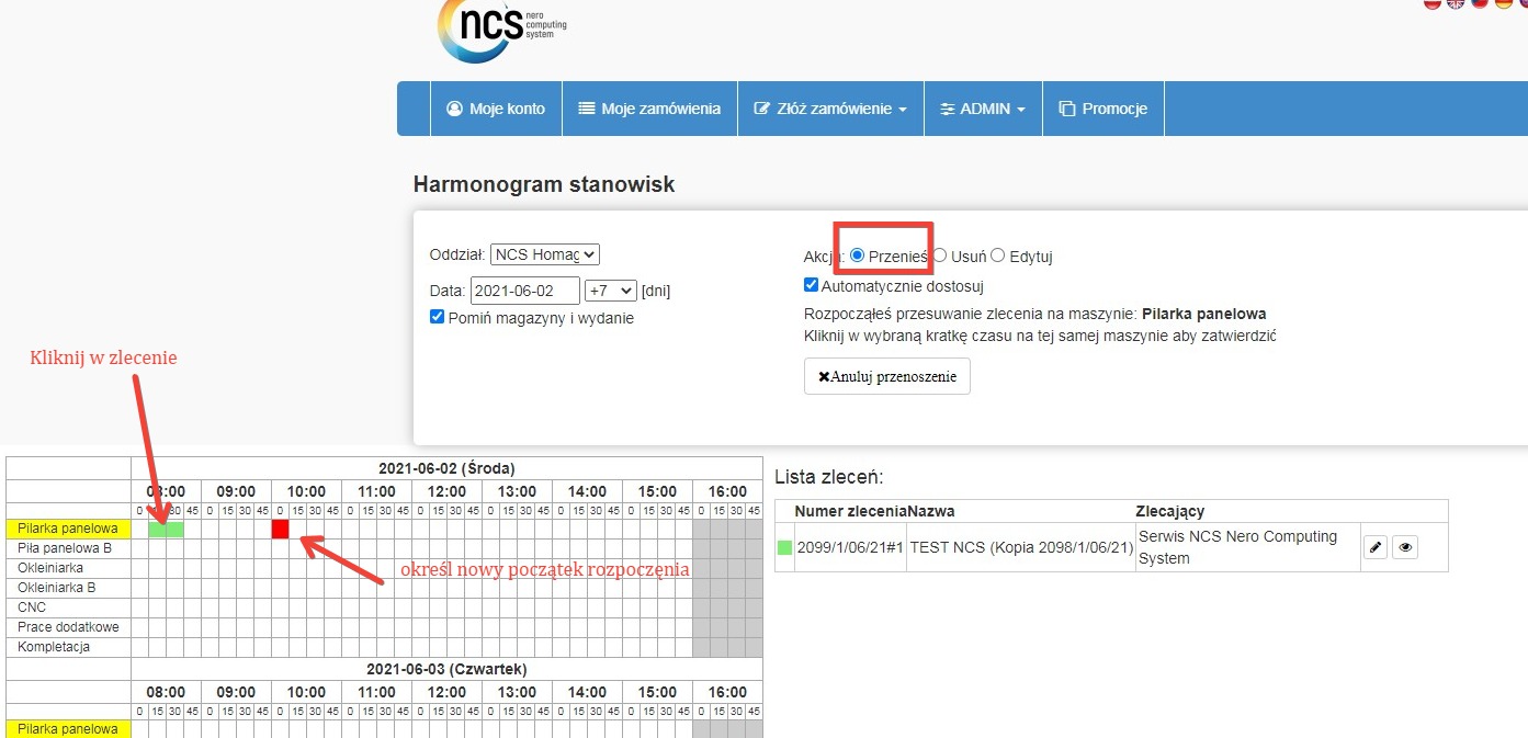 Widok umożliwia przenoszenie zlecenia w obrębie tego samego typu stanowiska na inne stanowisko i termin. Jeżeli chcemy zmienić datę początku realizacji zlecenia na pile wówczas: