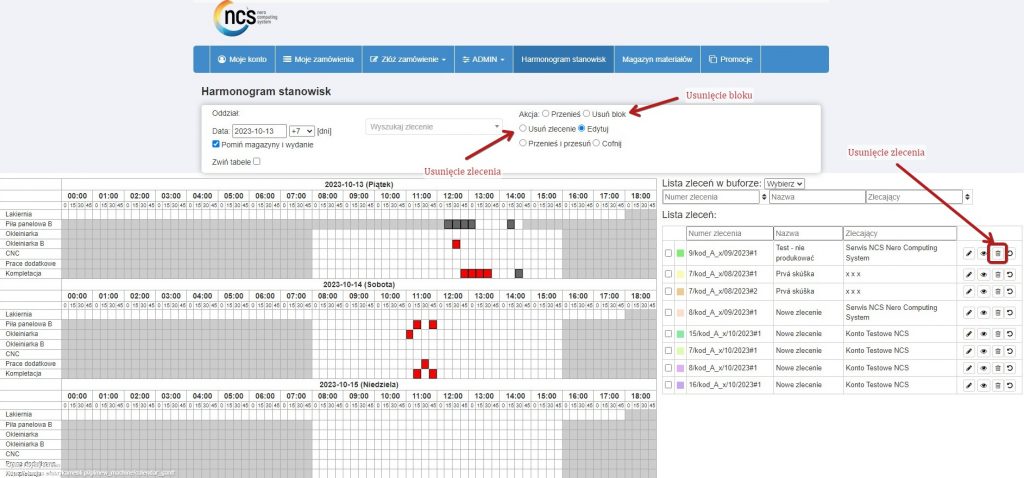 Aby usunąć tylko przydzieloną część realizacji z wybranego stanowiska wybierz opcję „Usuń blok”, a następnie kliknij w tabeli wybraną część realizacji zlecenia.