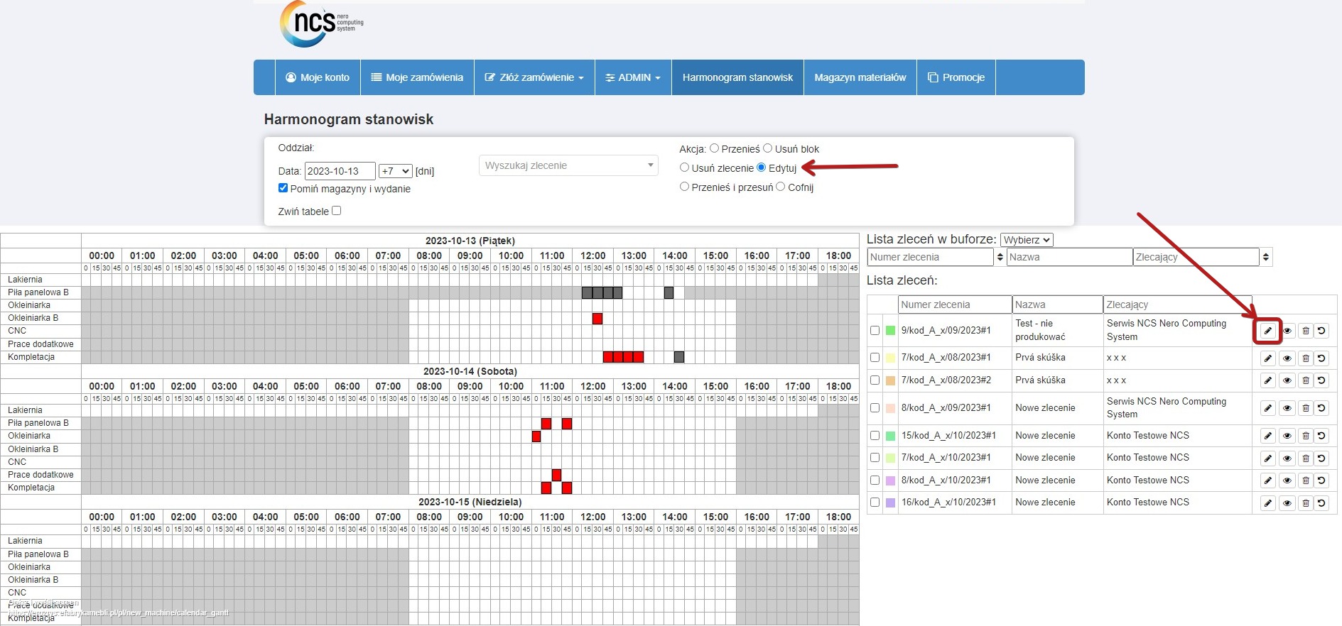 Widok ten umożliwia edycję w jednym zbiorczym widoku całej ścieżki zlecenia. Można tam przejść wybierając akcję „Edytuj” a następnie klikając w tabeli wybrane zlecenie lub klikając ikonę ołówka na liście zleceń: