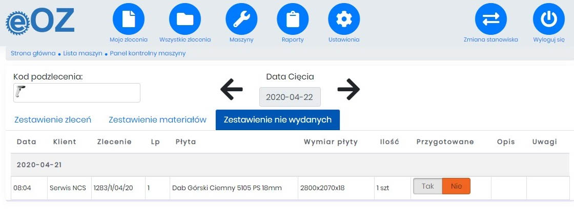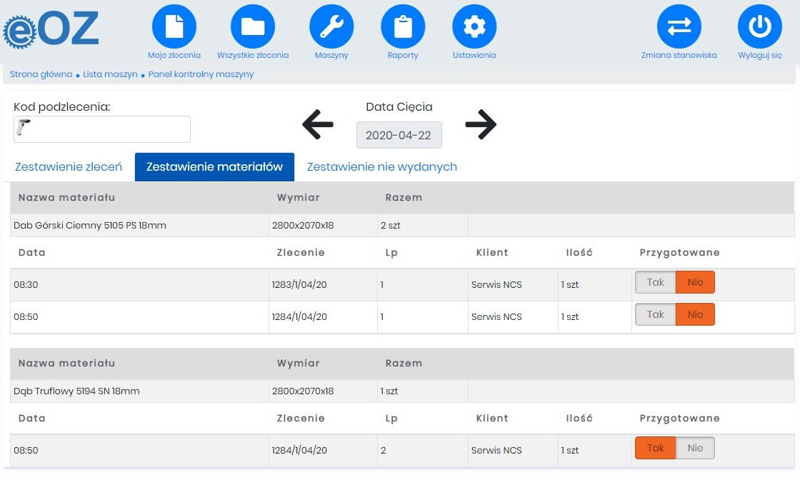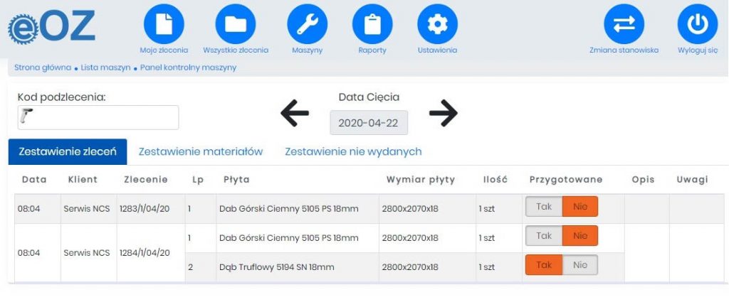 Pozwala wybrać dzień na który mają być przygotowane materiały do cięcia na pile oraz umożliwia współpracę z czytnikiem kodów kreskowych.