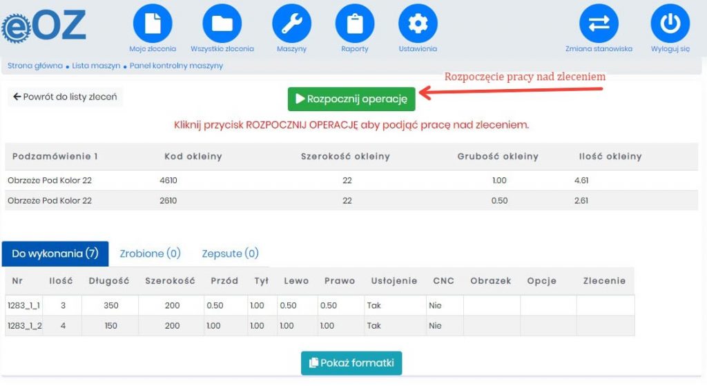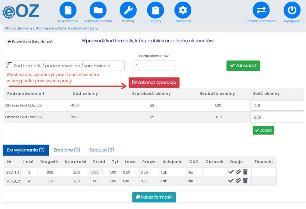 W przypadku przerwania pracy nad zleceniem przez pracownika lub oznaczenia jakieś formatki jako uszkodzona istnieje konieczność ręcznego zamknięcia zlecenia. Natomiast podczas normalnego trybu pracy takie zamknięcie i przekazanie zlecenia dalej następuje automatycznie z chwilą oznaczenia jako wykonanie ostatniej formatki.