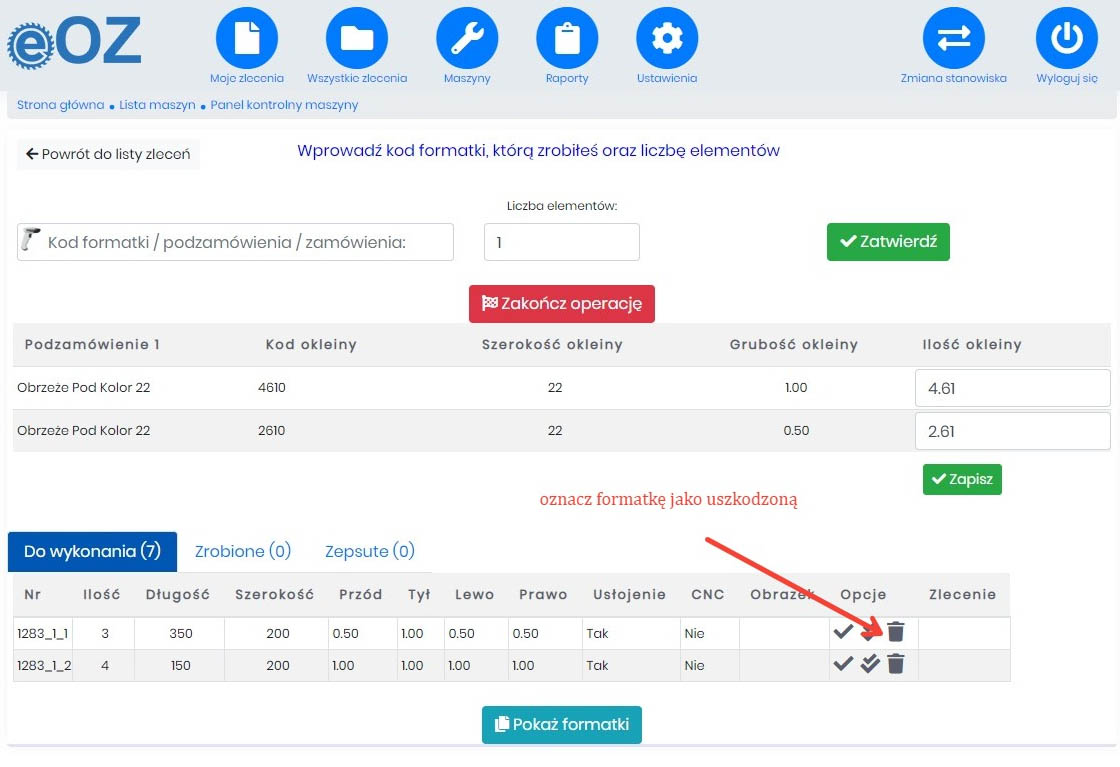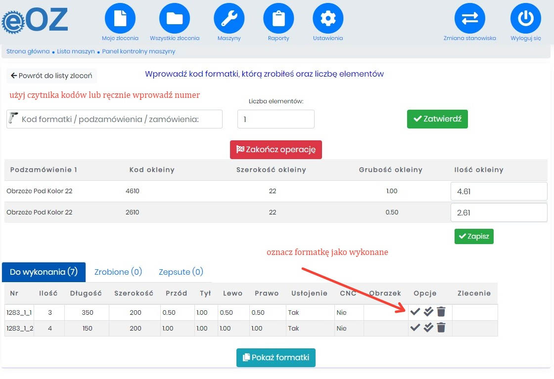 Oznaczanie formatki jako wykonanej