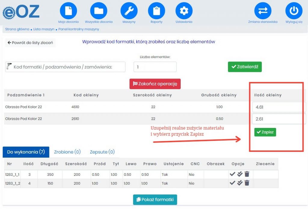 Panel umożliwia zapisanie użytkownikowi realną ilość materiału, jaki został zużyty podczas produkcji zlecenia. Informacja ta jest później ujęta w odpowiednich raportach