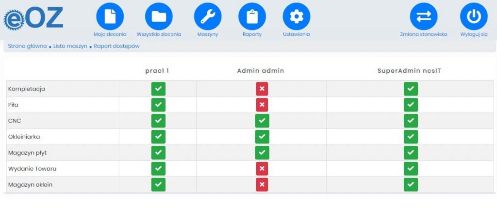 Raport prezentuje zestawienie w formie tabeli listę dostępnych maszyn w systemie oraz listę wszystkich użytkowników z zaznaczeniem jaki użytkownik posiada dostęp do jakiej maszyny.