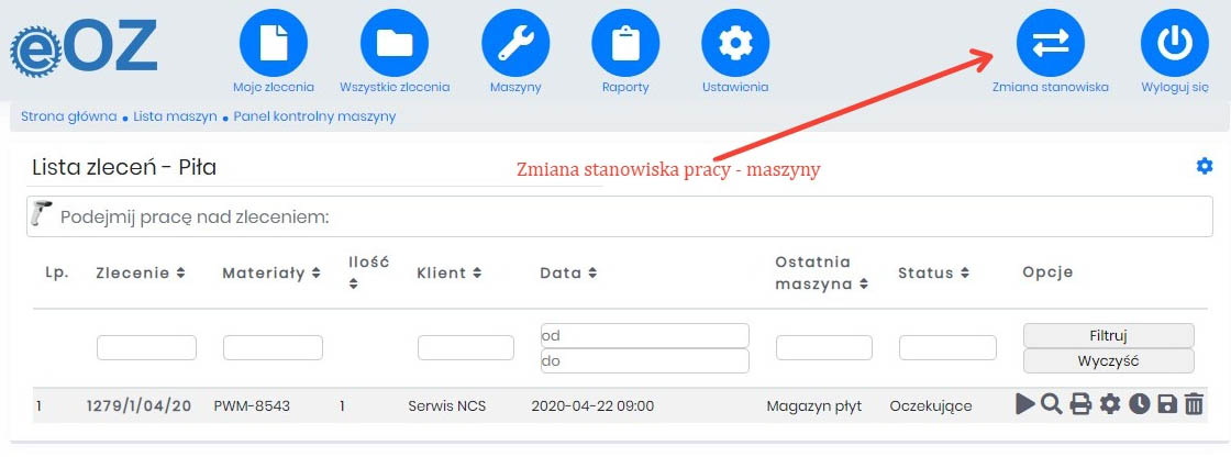 W zależności na jaką maszynę użytkownik jest aktualnie zalogowany, panel „Moje zlecenia” będzie inaczej wyglądać – dostosowany do specyfiki jej działania