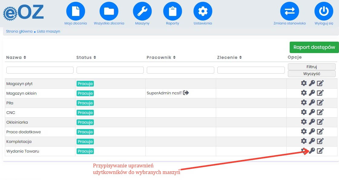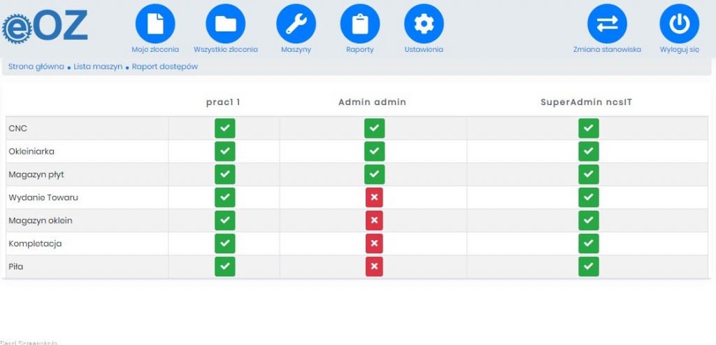 Dostęp do raportu wyłącznie dla użytkownika posiadającego uprawnienia „Raporty -> Raport uprawnień do maszyn”
