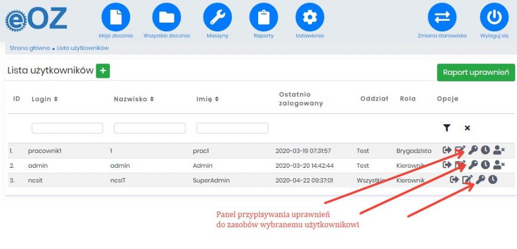 - Przypisanie uprawnień użytkowników – Możliwość przypisania poszczególnym użytkownikom systemu dostępu do panelu obsługi zleceń na wybranej maszynie