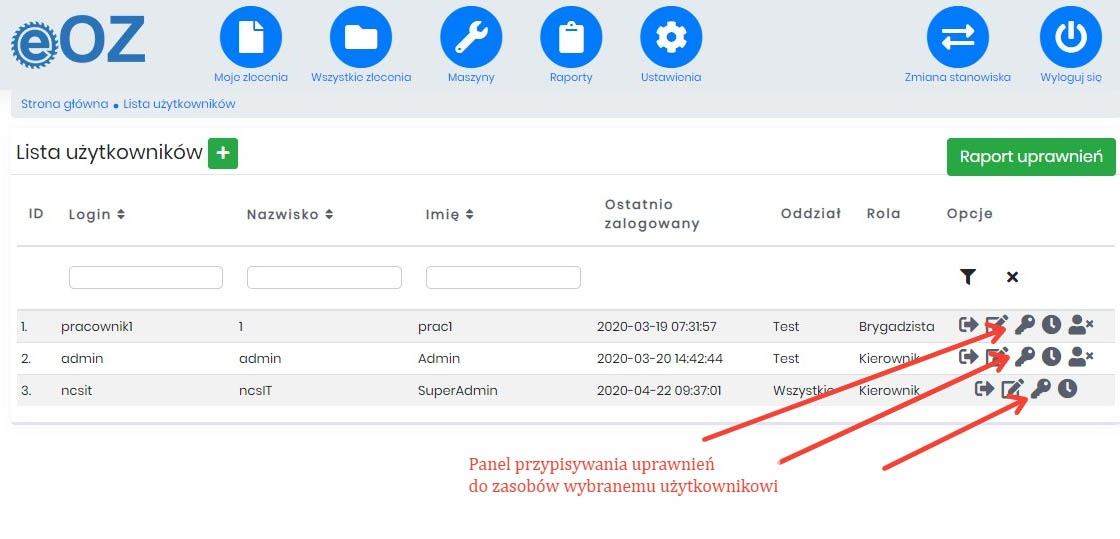 - Zarządzanie użytkownikami – Pełne uprawnienia do zarządzania użytkownikami, dodawanie, usuwanie kont, przypisywanie im uprawnień i przeglądanie raportu uprawnień