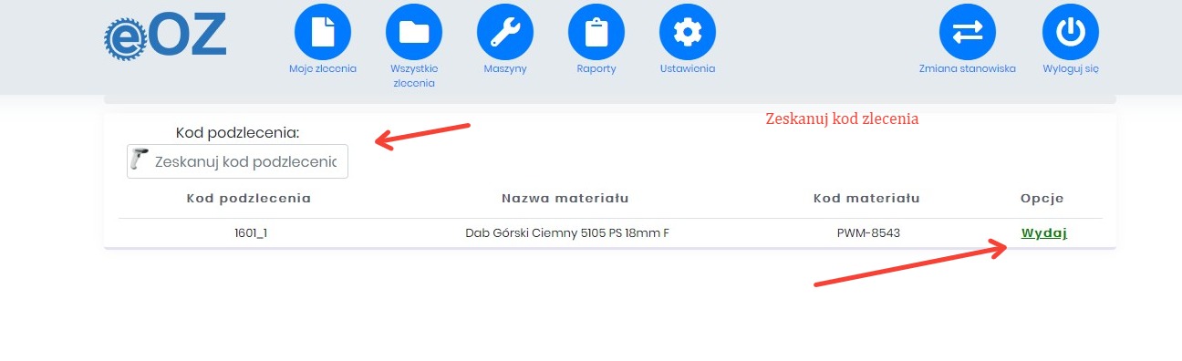 Pracownik w celu ułatwienia pracy może zeskanować kod kreskowy zlecenia lub wybrać na ekranie z listy zleceń do wydania odpowiednią pozycję.