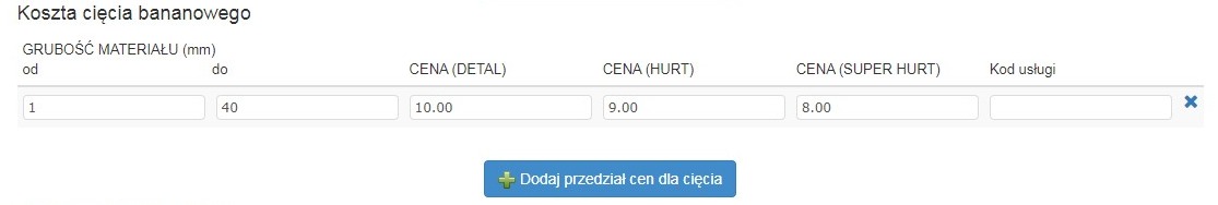 W tym celu proszę wejść w Menu Admin -> Ustawienia oddziału, zakładka cięcie, następnie w pozycji „Koszt cięcia bananowego” ustawić cennik dla zakresów grubości ciętego materiału