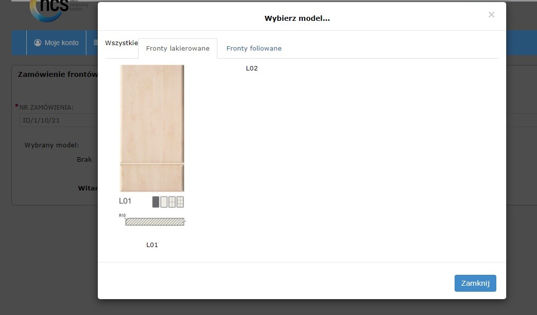 W pierwszej kolejności należy kliknąć opcję „wybierz model” – wówczas pojawi się okno z listę dostępnych modeli frontów pogrupowana według kolekcji. Na przykład kolekcja Fronty lakierowane, Fronty foliowane.