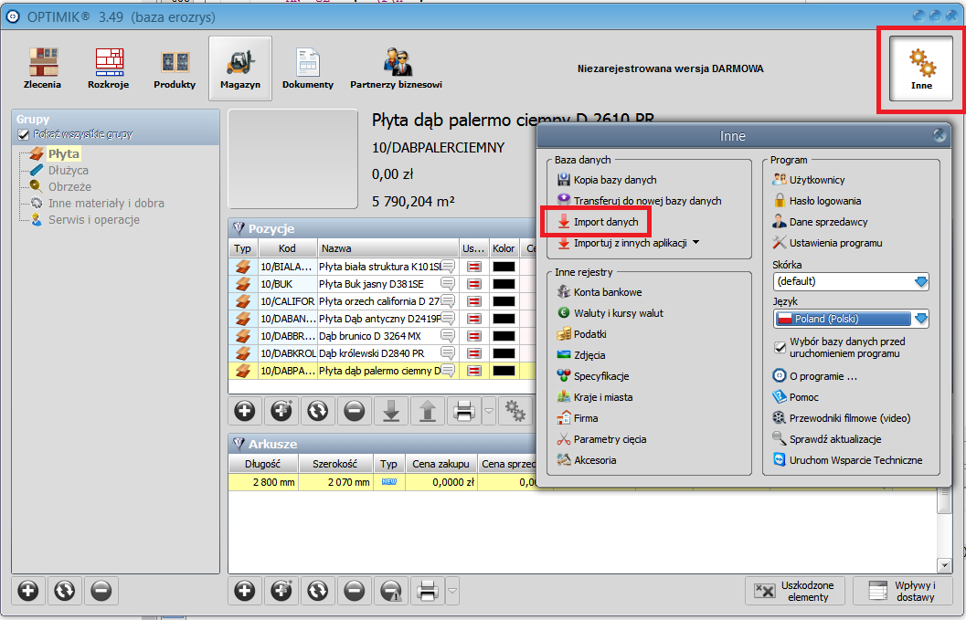 2. Aktualizacja magazynu, następnie wybieramy przycisk "Import" i wskazujemy eRozrysowy plik z bazą płyt.