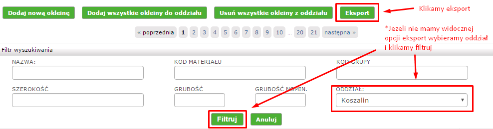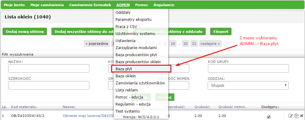 Przed zrobieniem importu do optymalizatora Cut Rite, należy wyeksportować aktualną bazę z eRozrysu. Robi się z poziomu menu ADMIN -> Baza płyt: