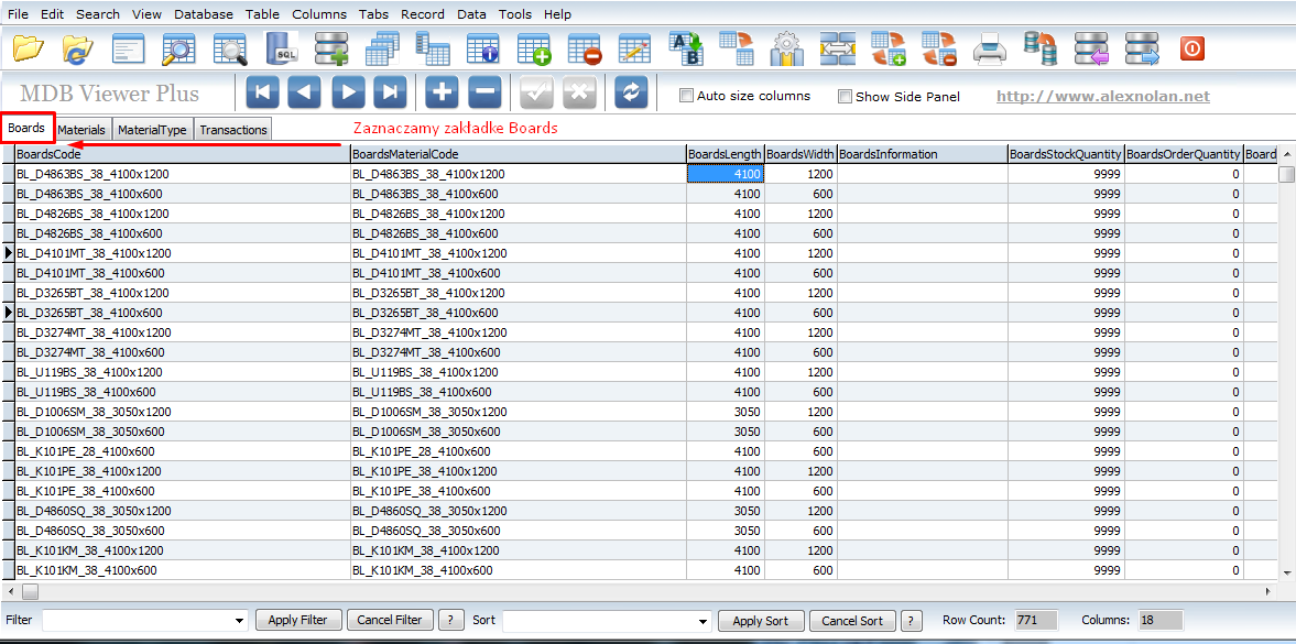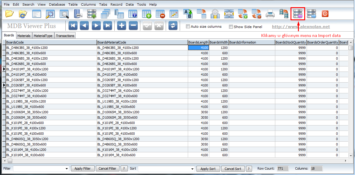 Następnie zamykamy program i otwieramy na nowo. Następnie należy wykonać te same kroki dla zakładek "Materials" oraz "MaterialType" (pamietając by wybrać ścieżkę do materials.csv i materialType.csv zamiast boards.csv).