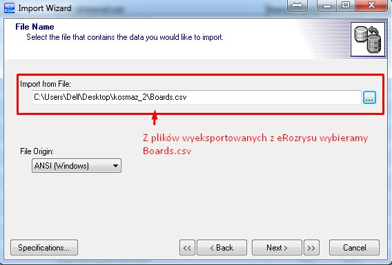 W następnym oknie należy wskazać scieżkę do wyeksportowanego z eRozrysu Boards.csv i wcisnąć "next":