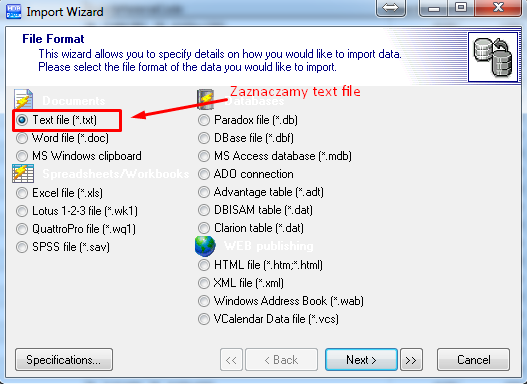 Otworzy się okno importera. Należy w nim zaznaczyć opcję "text file" i wcisnąć przycisk "Next":