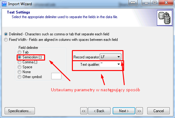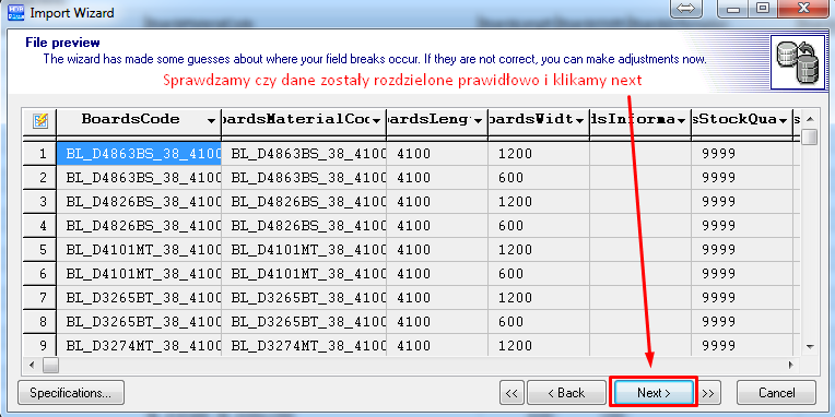 W następnym oknie sprawdzamy czy dane są prawidłowo rozdzielone. Jeśli tak, wciskamy "next":