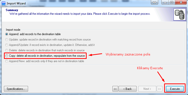 W następnych dwóch oknach wystarczy kliknąć "next". Kiedy wyświetli się okno podsumowania ("summary"), należy wybrać opcję "copy" (jak na grafice poniżej) i wybrać "execute":