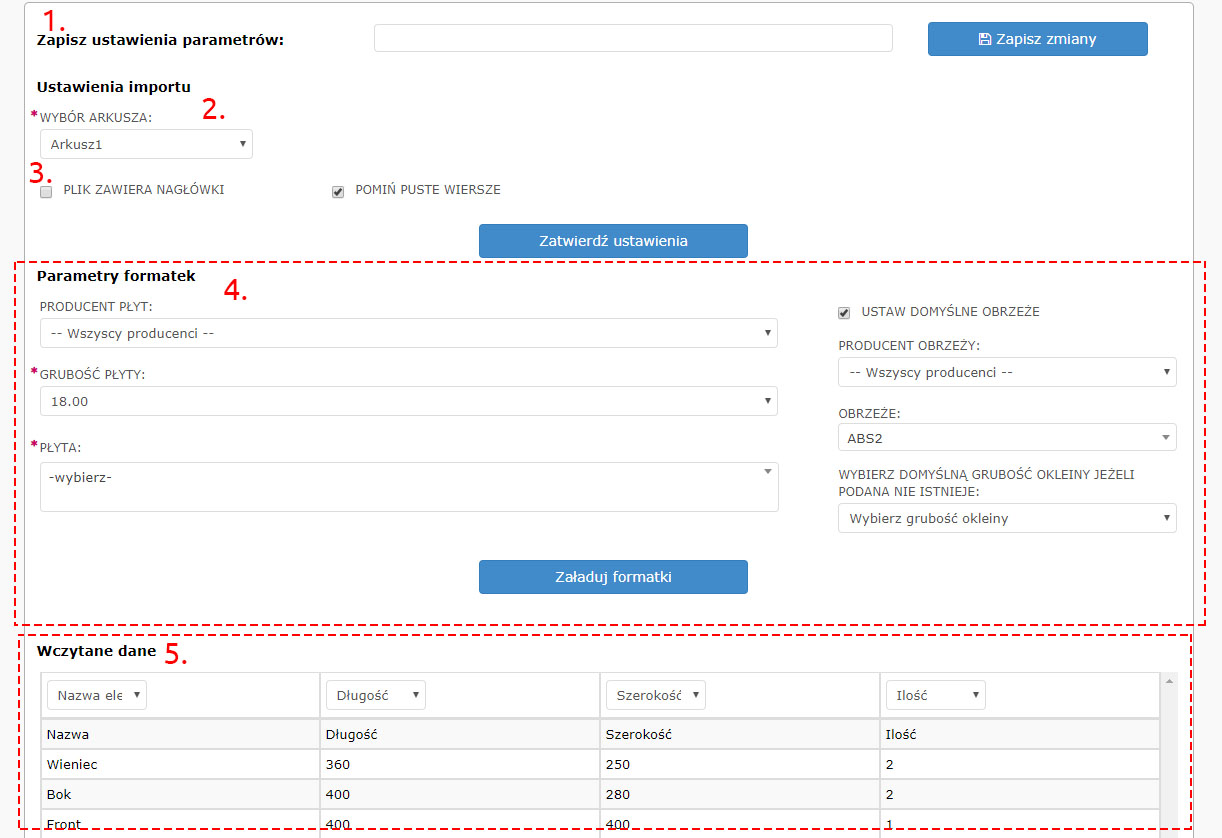* w przypadku zdefiniowania kolumny dotyczącej materiału jaki jest przypisany do formatki w wierszu, systemu automatycznie rozdzieli zaimportowanie zamówienie na podzamówienia pogrupowane według materiałów