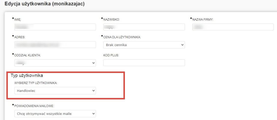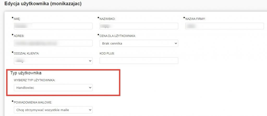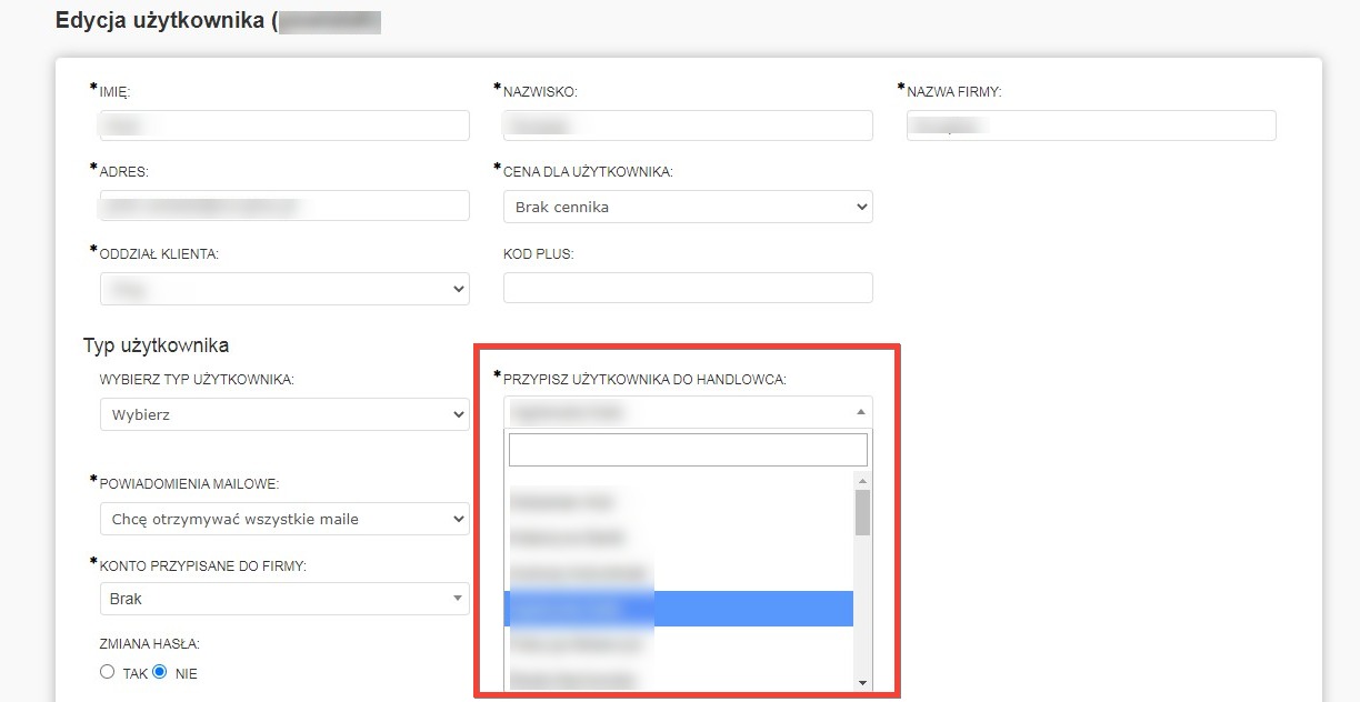 W celu przypisania konta klienta do wybranego handlowca należy przejść do edycji profilu klienta (jak powyżej dla Handlowce) a następnie w pozycji