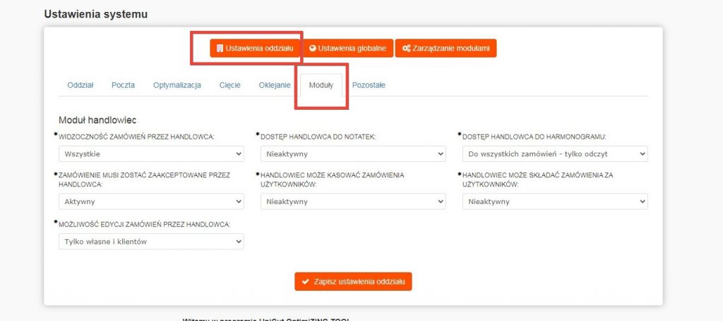 Admin -> Ustawienia -> Ustawienia oddziału -> Moduły