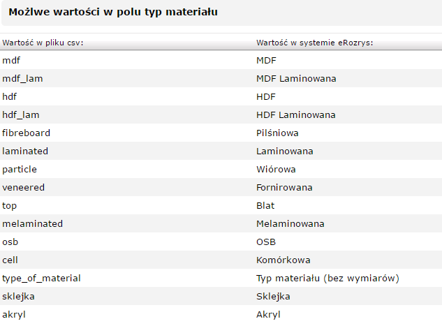 - Typ płyty – pole określa typ danej płyty. Pole może przyjmować tylko określone wartości – są one opisane w panelu eksportu pliku CSV (zakładka ADMIN -> Zarządzanie bazą materiałów -> Import / Eksport baz). Poniżej zrzut ekranu z tego panelu: