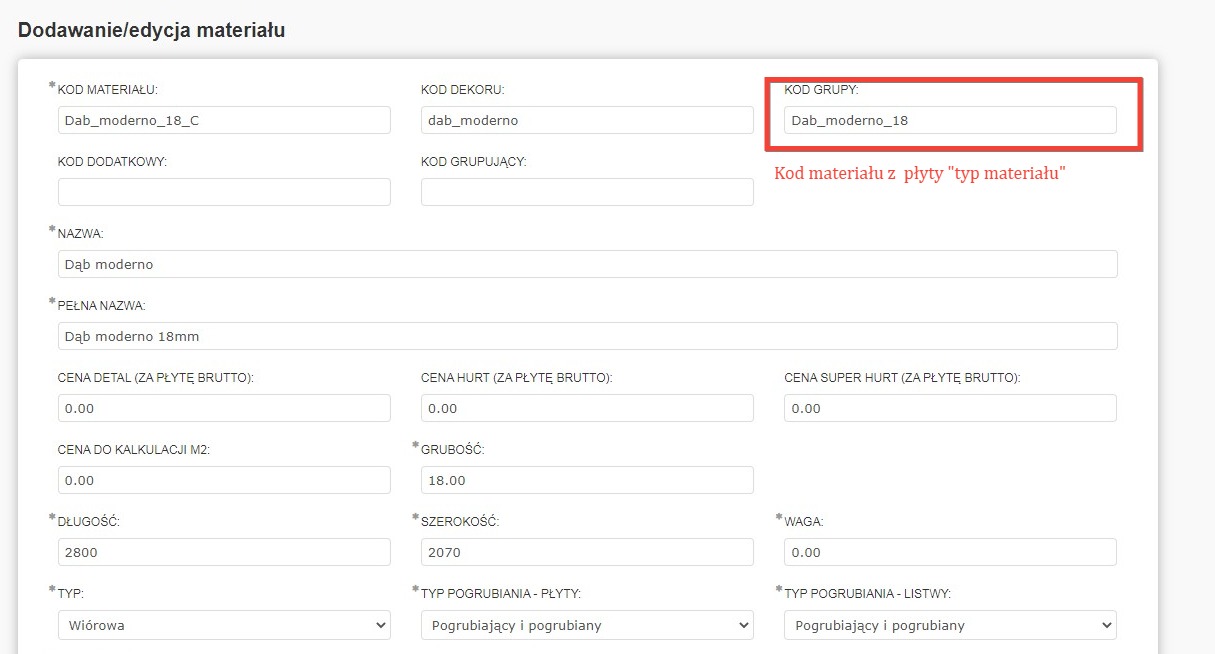 – tworzymy dodatkową płytę, która w polu typ materiału ma wprowadzoną wartość „type_of_material”, o nazwie np. „Dab_moderno_18” . Kod płyty i takim samym kodzie grupy „Dab_moderno_18” ,