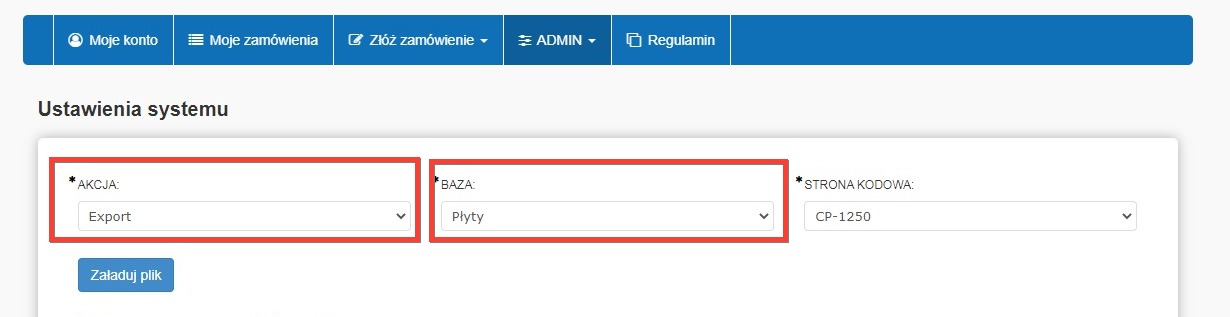 Wybieramy akcję „Export”, typ bazy „płyty” a następnie klikamy przycisk „Załaduj”.