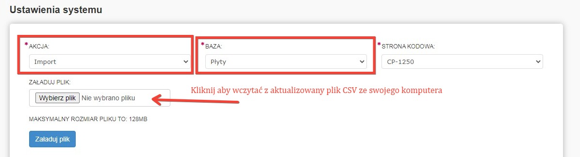 Następnie wybieramy akcję „Import”, typ bazy „Baza płyt” i klikamy przycisk „Wybierz plik” aby wskazać z aktualizowany plik na lokalnym dysku komputera. Następnie klikamy „Załaduj plik”.