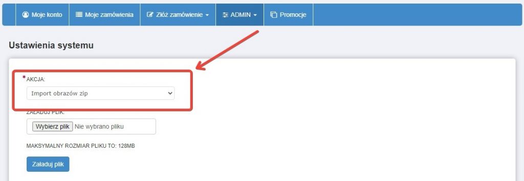 Akcja „Import obrazków zip” obsługuję zarówno grafiki dla płyt jak i oklein, istnieje możliwość jednoczesnego importu dla tych dwóch grup.