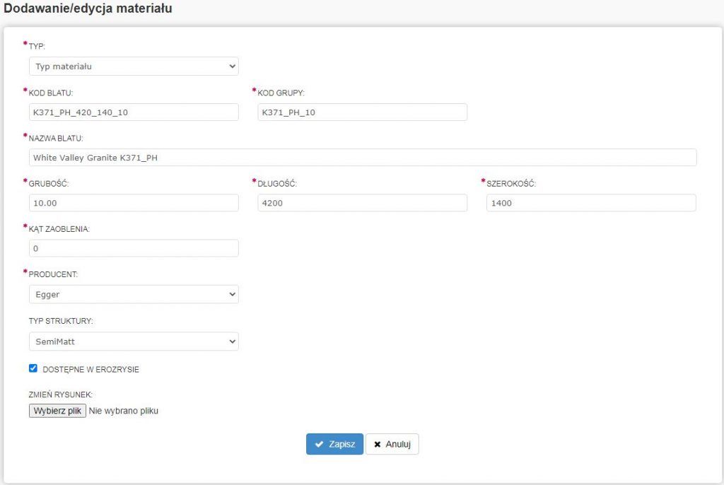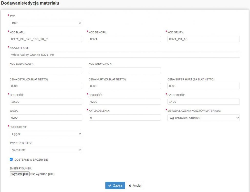Pierwszy krok do dodania nowego blatu to dodanie typu materiału w (zakładce „TYP” wybieramy „typ materiału”), jest to pozycja w bazie danych nie widoczna w procesie składania zamówienia, zawierają się tu takie pozycje jak nazwa materiału czy wymiary blatu, które są największymi wartościami które są dopuszczone do produkcji. Następnie uzupełniamy kolumny widoczne na zdjęciu powyżej. Kolejno dodajemy nowy blat, tym razem w zakładce „TYP” wybieramy „blat”.