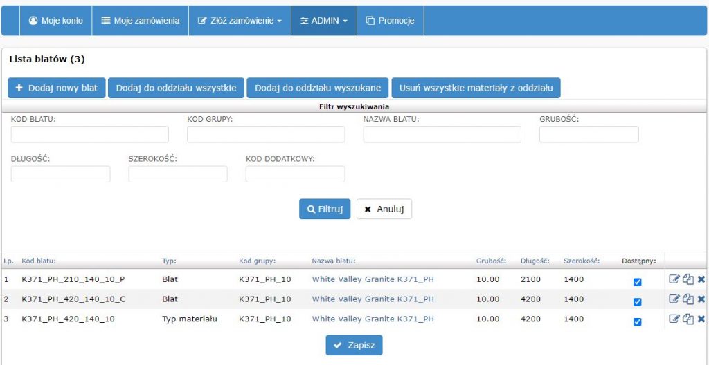 Bazą blatów można zarządzać z poziomu panelu ADMIN -> Zarządzanie bazą materiałów -> Baza blatów. Przedstawia się on następująco: